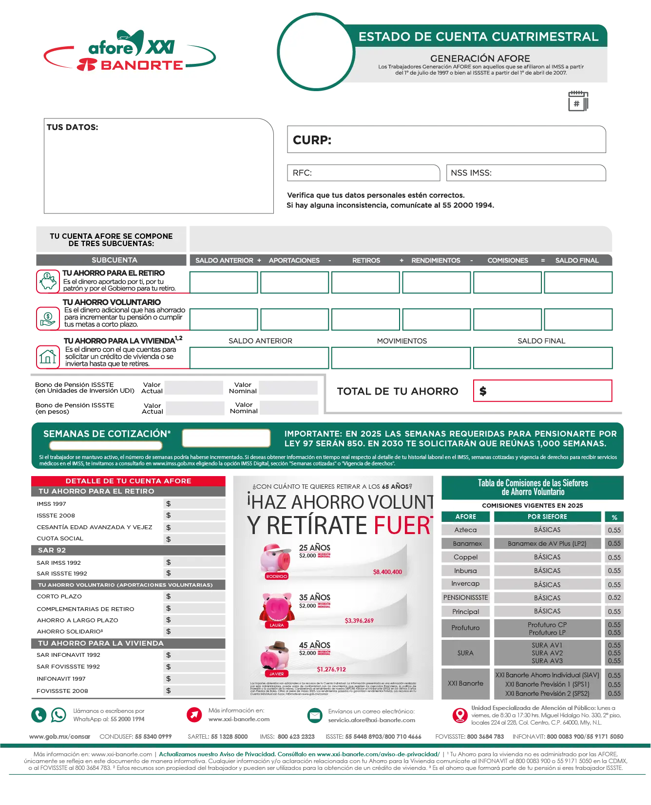 • Tu Ahorro Voluntario: Incluye aportaciones de corto y largo plazo, complementarias para el retiro y ahorro solidario.