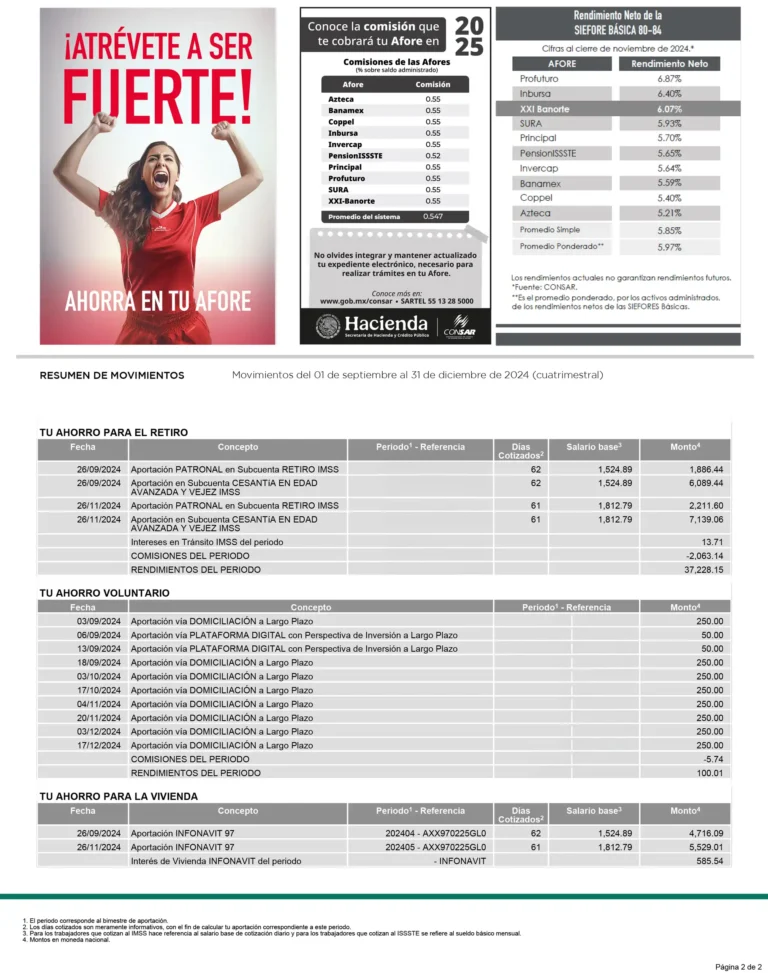 • Tu Ahorro para el Retiro: Incluye IMSS 1997, ISSSTE 2008, Cesantía en Edad Avanzada y Vejez, y Cuota Social.